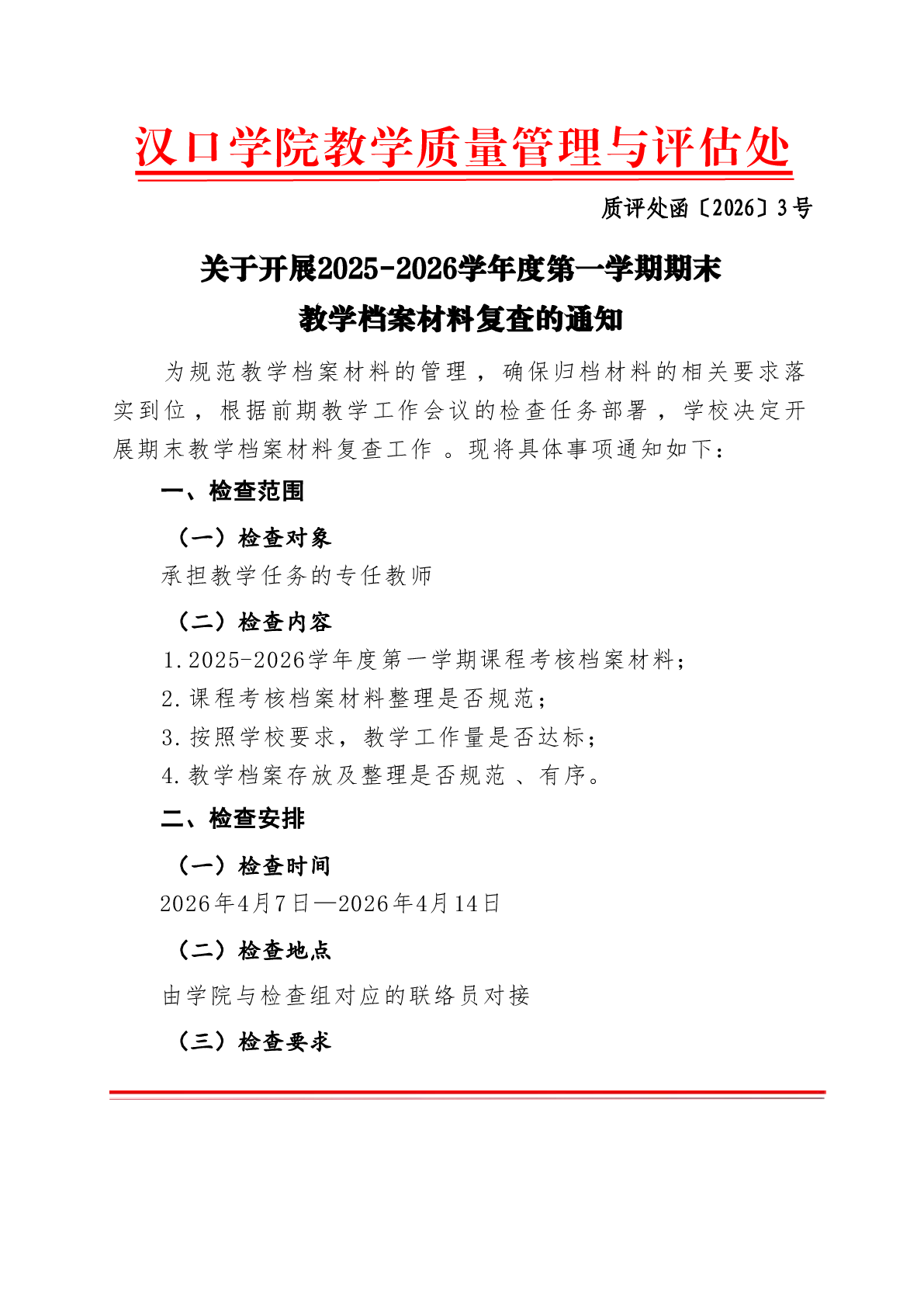 关于开展2025-2026学年度第一学期期末教学档案材料检查的通知